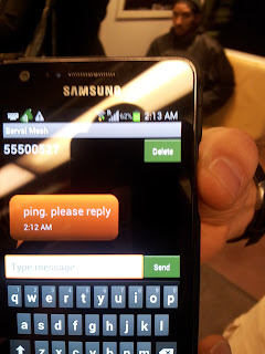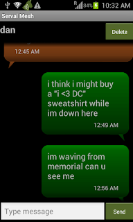 Some of us stood at the Washington Monument while others were at the Lincoln Memorial -- a distance of nearly a mile. Using two Mesh Extenders, we successfully sent text messages and shared files between our phones (running Serval) -- entirely independent of the cellular infrastructure.